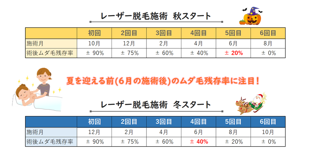 冬スタートだとまだ少しばかりムダ毛が取り切れていないという状況が考えられます。 もちろん、これはあくまでもイメージであり、患者さまの元々の毛量などによっても変わってきます。それでも、毛周期の関係上2ヶ月は施術間隔をお空けいただきたい事情がございますので、逆算していくと「秋スタートがベスト」ということになります。